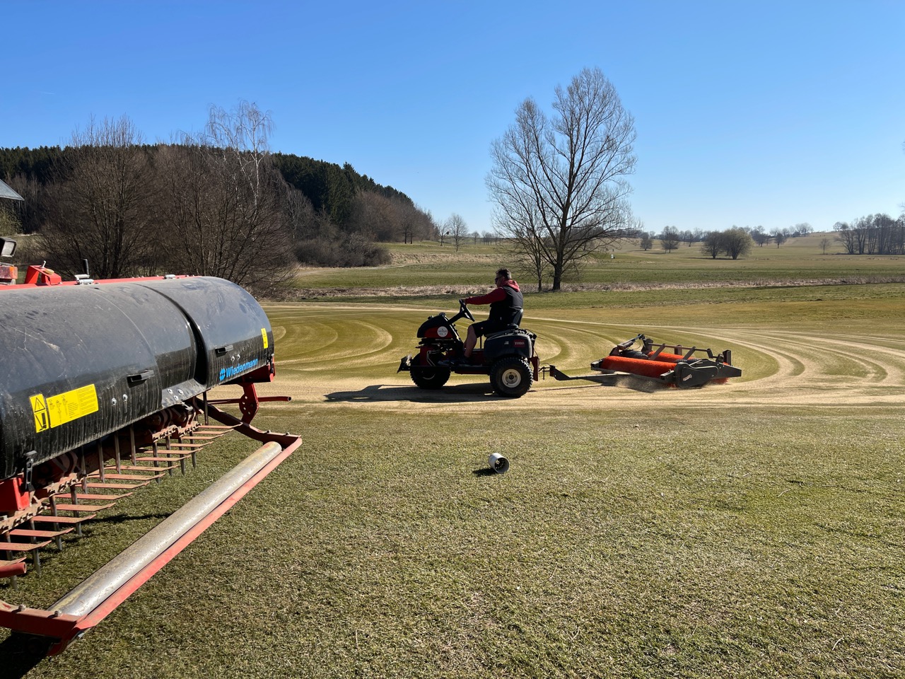 In der Fachsprache nennt sich dieses Sanden des Grüns Aerefizieren. Hier werden mit einer speziellen Maschine kleine Löcher, so genannte Hohlstacheln, in den Erdboden gebohrt und diese mit Sand aufgefüllt. Wichtig ist, dass der Sand auf den Grüns abtrocknen kann, da sich nur trockener Sand in die ausgestochenen Löcher verfüllen lässt. Da es im Moment nicht regnet, ist genau jetzt die richtige Zeit dafür.